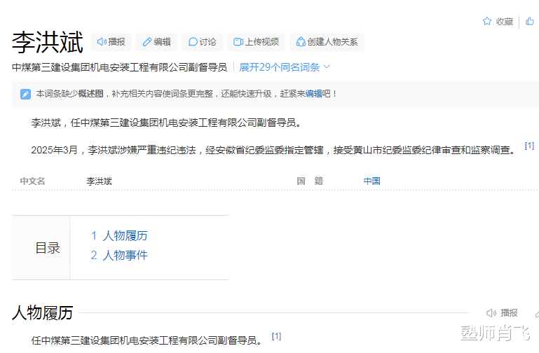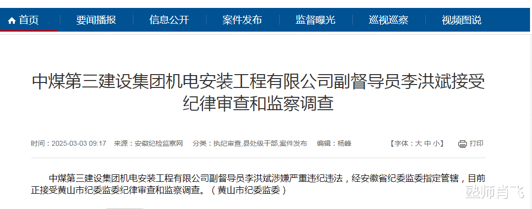 黄山纪委消息,中煤三建集团公司机电安装工程公司副督导员李洪斌涉嫌严重违纪违法被查。