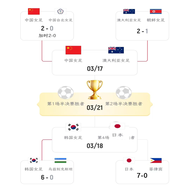 在前两天结束的3场比赛里,澳大利亚2-1逆转朝鲜,中国加时鏖战2-0险胜中国台北,韩国6-0轻取乌兹别克斯坦。至此,半决赛对阵就已经出炉,澳大利亚VS中国,韩国VS日本。