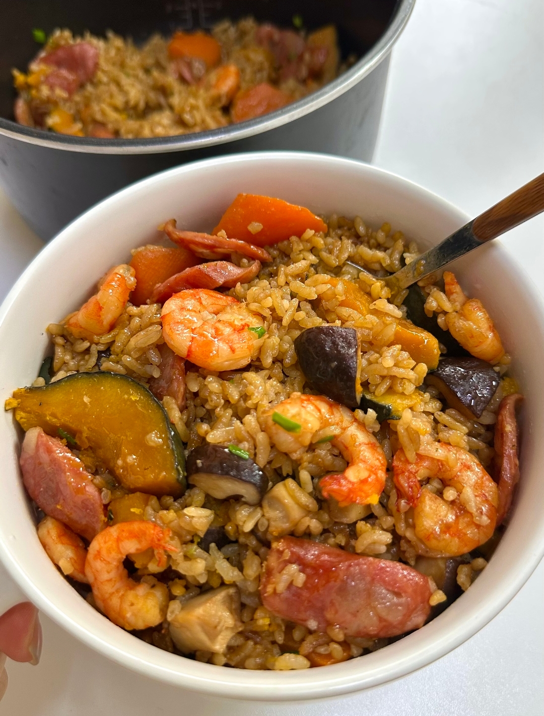 家人们谁懂啊!下班回家只想瘫着,娃还吵着要吃好吃的,不想在厨房折腾半天,又想做出营养又美味的饭菜,这道电饭煲大虾南瓜腊肠焖饭简直是我的救命稻草!不用颠勺不用看火,往电饭煲里一丢,等着就能收获一锅香到邻居来敲门的焖饭,软糯的南瓜、Q弹的大虾、油润的腊肠裹着粒粒分明的米饭,一口下去,疲惫直接烟消云散~