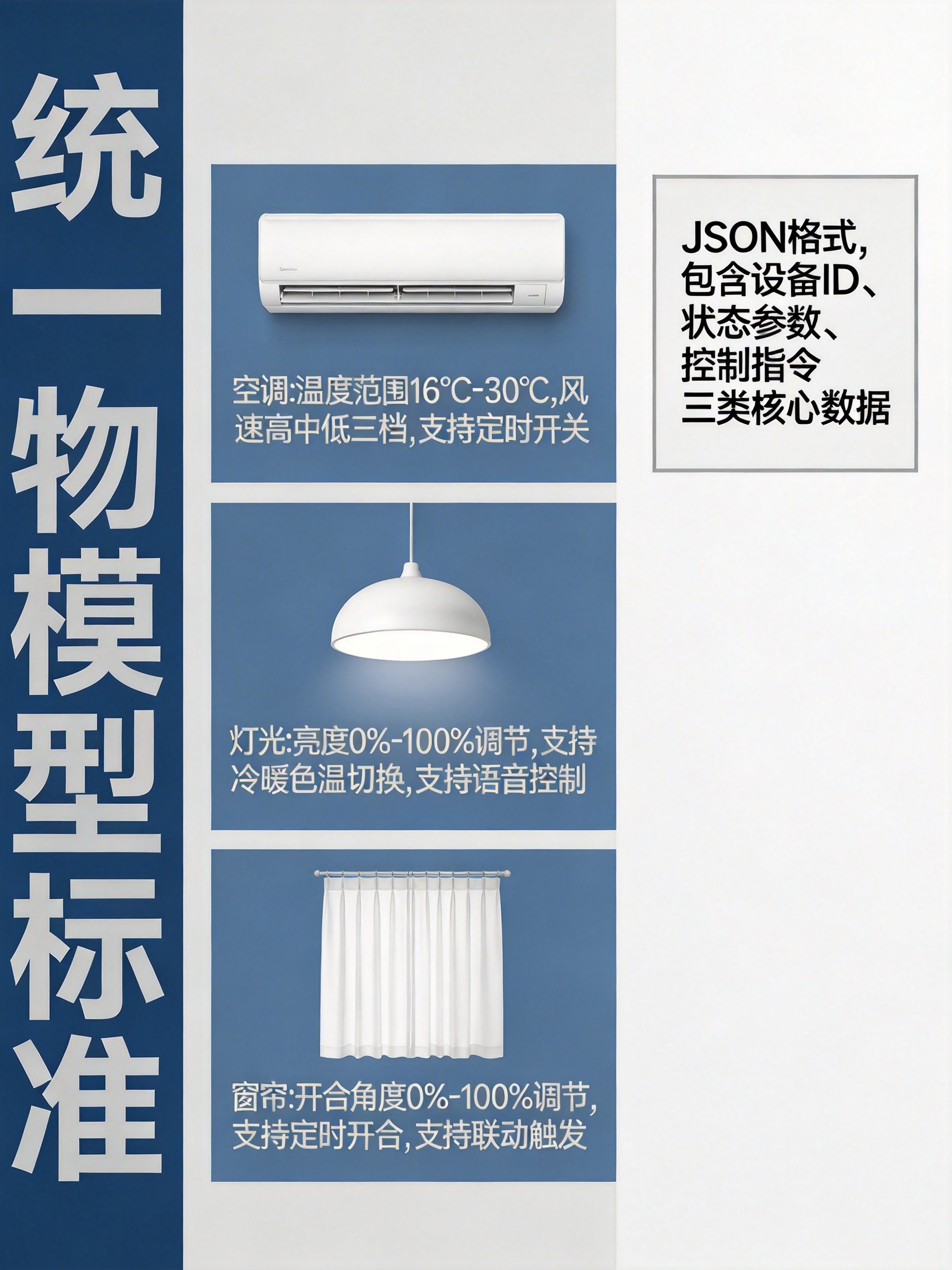 2. 统一物模型 这是标准的核心创新。过去,不同品牌对同一类设备的定义各不相同: - 空调:有的叫“temperature”,有的叫“temp_set”,单位有摄氏和华氏之分 - 灯光:亮度参数从0-100、0-255、0-1000不等
