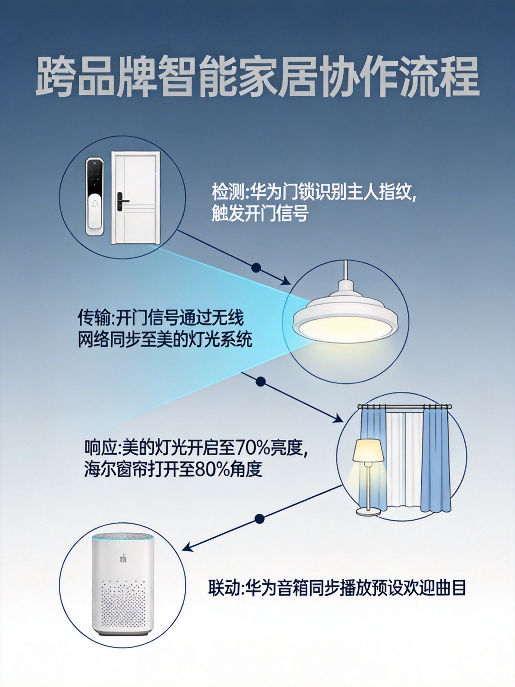 这个场景可能涉及: - 华为的毫米波雷达(人体检测) - 美的的智能灯光 - 海信的智能音箱 - 海尔的智能门锁