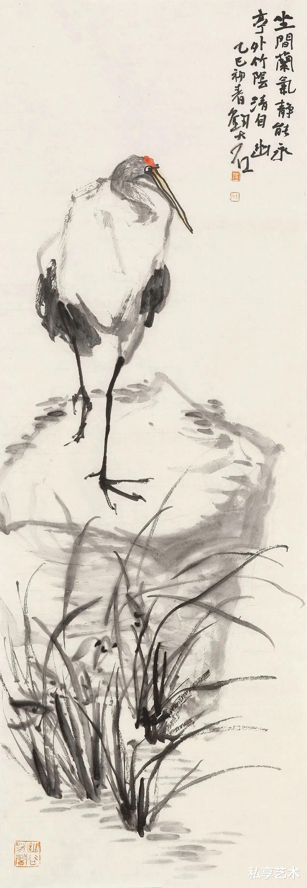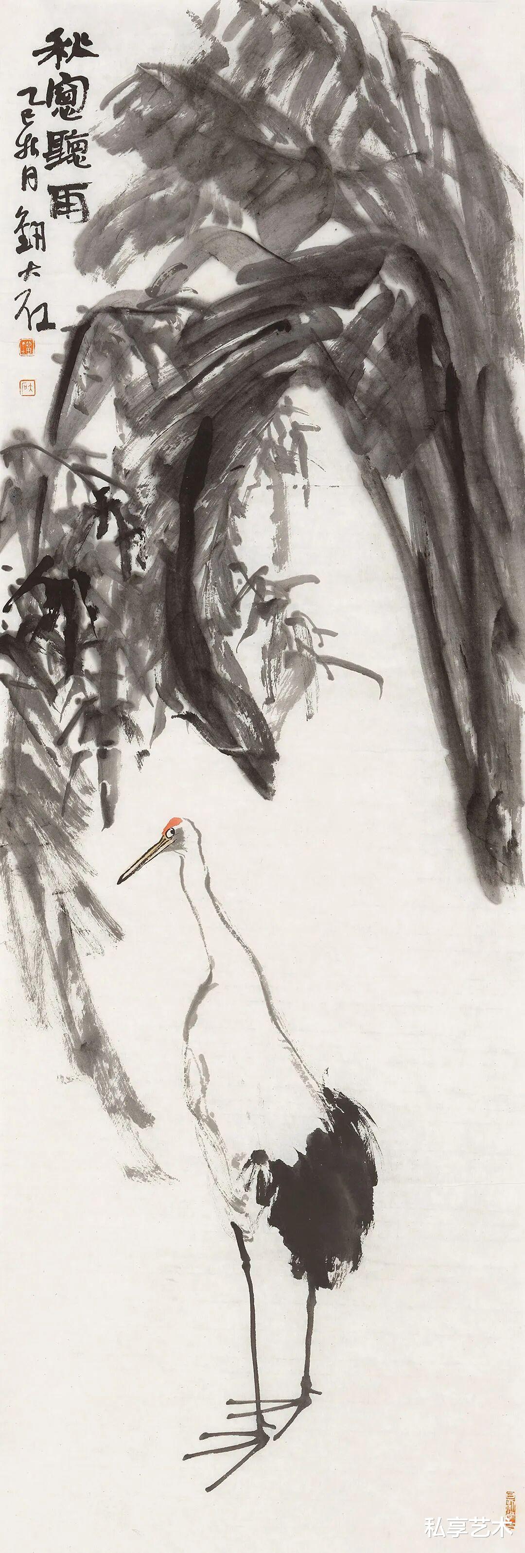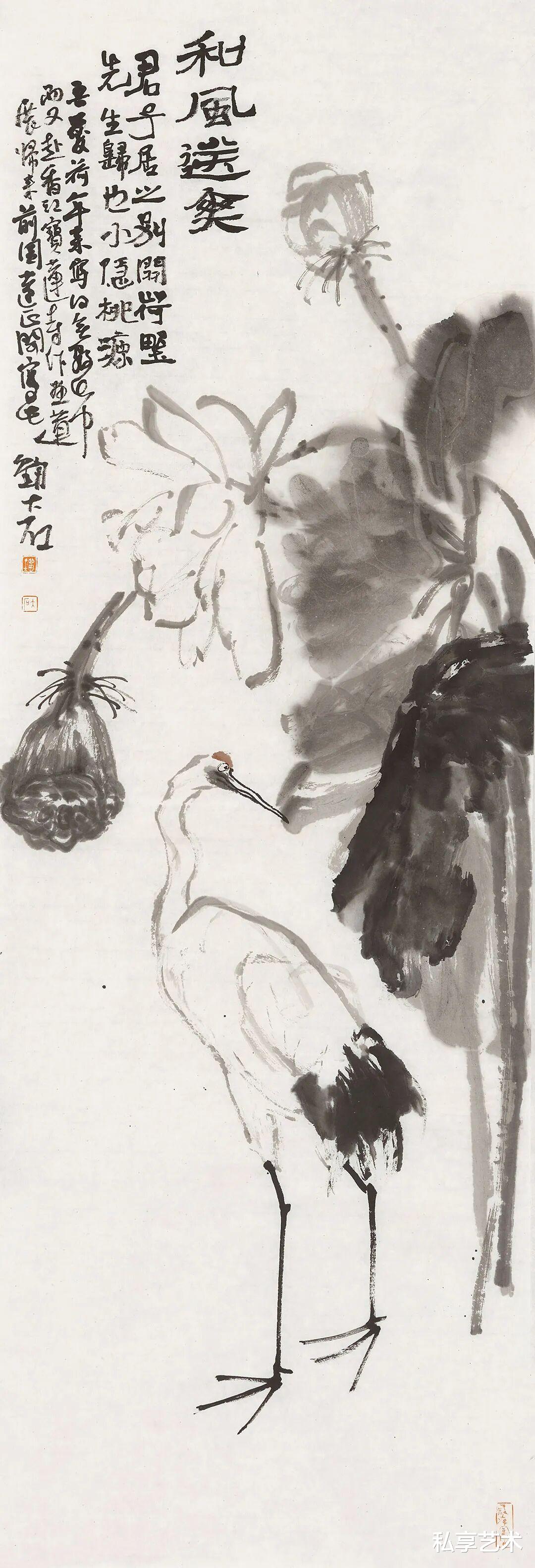 其花鸟写意,尤得文人正脉。以写代描,重神轻形,写鹤则清标高致,图花果则清雅如供,花木顽石,相映成趣。简淡为宗,留白生境,素净之中,自见灵气,一洗尘俗,满纸静气。