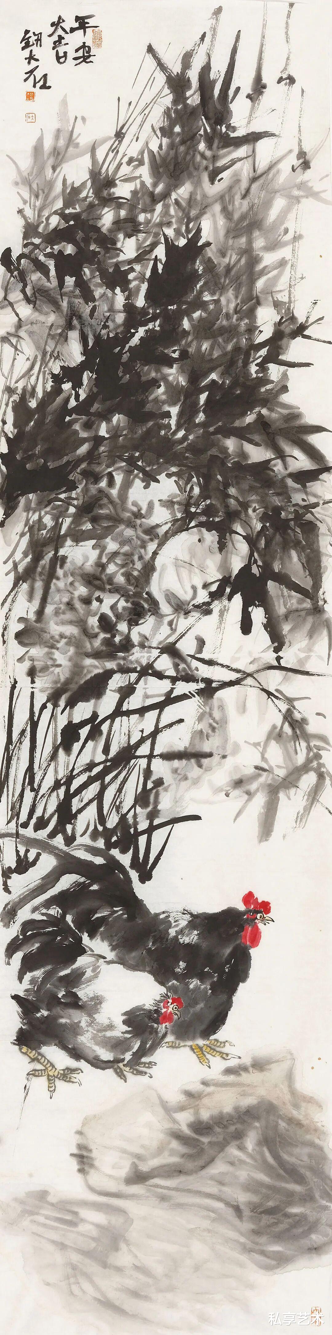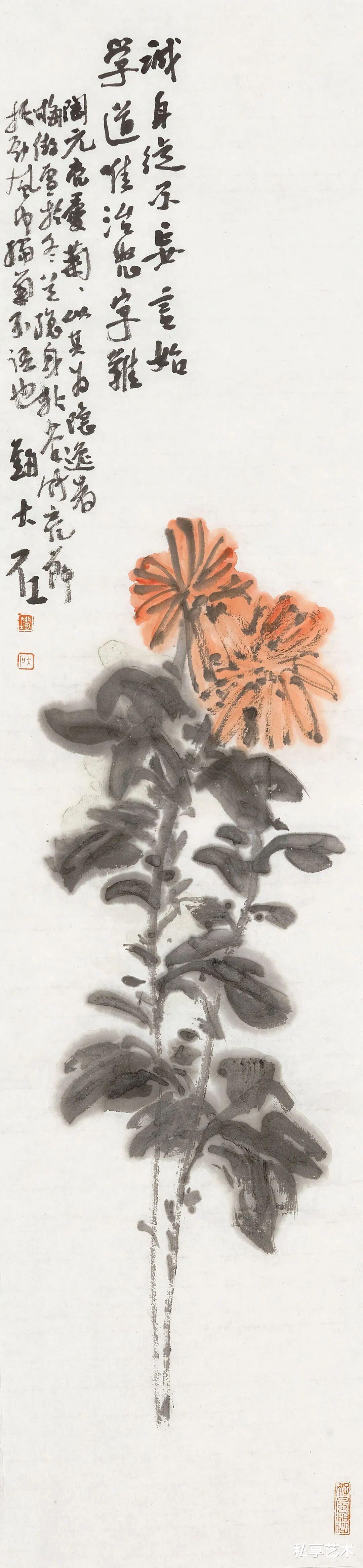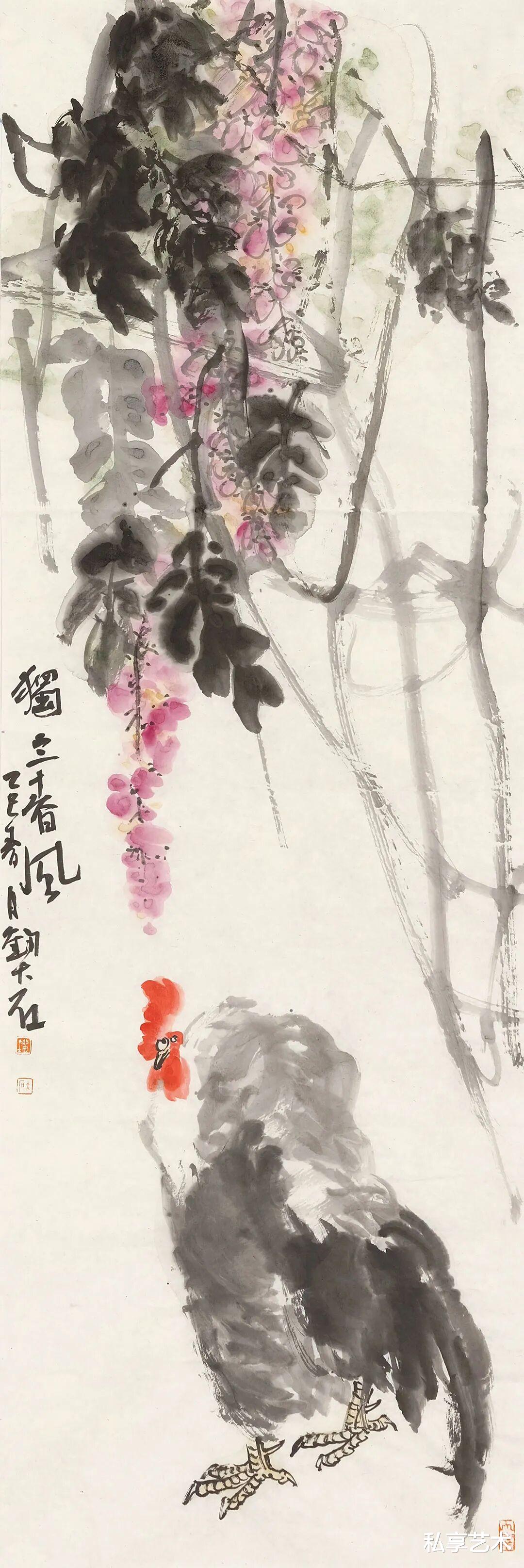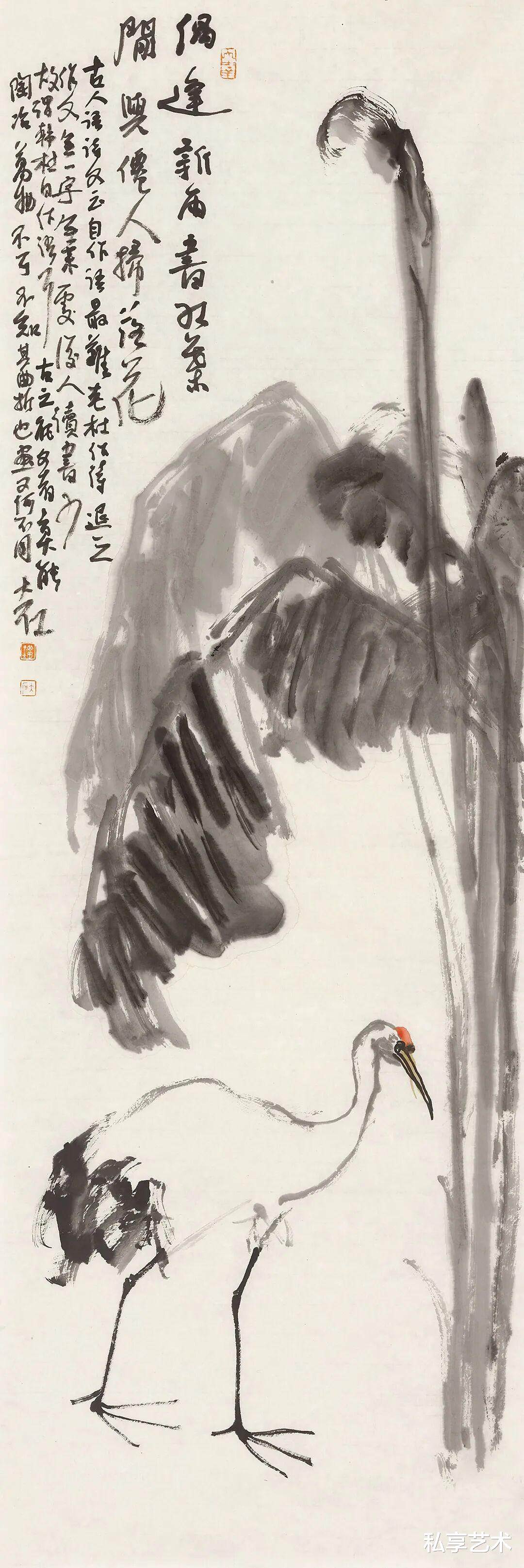 其花鸟写意,尤得文人正脉。以写代描,重神轻形,写鹤则清标高致,图花果则清雅如供,花木顽石,相映成趣。简淡为宗,留白生境,素净之中,自见灵气,一洗尘俗,满纸静气。
