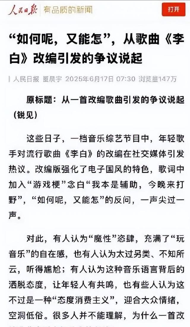 果不其然,官方媒体人民日报还是“看”不下去了,对于单依纯这首改编的《李白》,进行了点名!