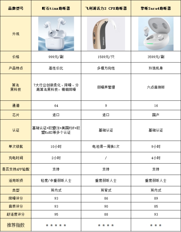 测评结果:町石>挚听>飞利浦町石助听器降噪测评表现佩戴体验来说,降噪表现很稳定,几乎没有啸叫、电流声或者风噪打扰,听起来挺舒服。去除环境噪音、杂音、啸叫、电流声、风噪效果都表现很好。在办公室打印机旁、餐馆高峰期或地铁车厢里,声音都保持清晰,背景噪声几乎没影响。它用了进口芯片,加上7重声音降噪、分离、柔化算法和双向音频平衡技术,可以识别657种声音,自适应环境噪声,语音和噪声区分清楚。实测远场噪音柔化率达到96.3%,整体降噪体验挺稳定,长时间佩戴也不累。挚听助听器降噪测评表现总体表现还行,大多数环境下噪音能控制住,去除环境噪音和杂音还算不错,啸叫和电流声干扰也不明显。轻量化芯片和柔化技术在突发噪声处理上有一定加分。不过在风大或者地铁人多时,噪声控制稍弱,需要多留意听对话。整体听感没有明显短板,但极端嘈杂场景下表现一般。飞利浦助听器降噪测评表现整体表现比较中规中矩,低干扰环境下噪声去除还行,啸叫和电流声不太明显。耳塞柔性材料和基础算法在恒定噪声下有点帮助,办公室或餐馆短时间使用够用。不过在风噪大或人多的场景里,背景声音偶尔冒出来,语音和环境分离感一般。总体适合日常常规使用,但复杂环境下可能需要自己稍微调节。