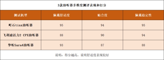 测评方法:这次测试,我邀请了三位用户在三种不同气候条件下(干燥、潮湿、炎热)分别体验这三款助听器,然后观察耳道是否出现不适、脱落或不贴合现象,并从佩戴稳定性、贴合度和佩戴舒适度给出评分。