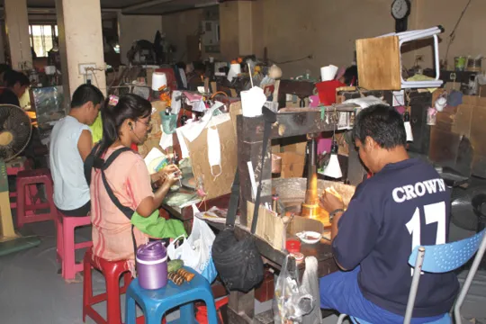 下午,阿宏带George Shen探访了一家专门生产批发玻璃充填红宝石的公司。这是George Shen首次接触此类宝石 —— 那些艳红透亮、切磨规整、扁豆大小的红宝石,让George Shen震惊不已。阿宏解释道:“玻璃充填红宝石是将次等红色刚玉加热至高温高压,把接近熔点的红色玻璃充填进其裂隙中制成的。” 公司内一派繁忙;工人们一边用剪刀分离烧制后粘连的充填红宝石原石,一边专注地切磨加工,马达的隆隆声与切磨机的吱吱声交织成一片;另一个房间外的过道上,几位宝石批发商正静静等候,依次进入室内拿货,生意的火爆可见一斑。