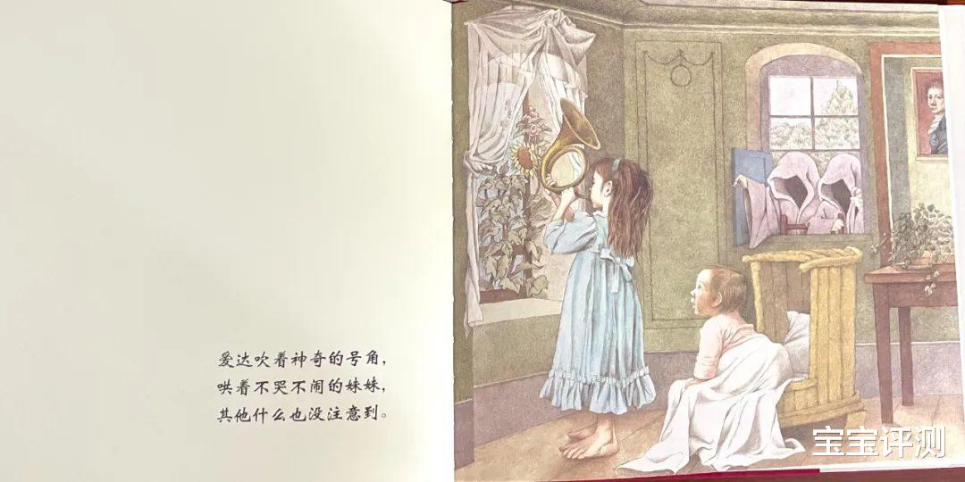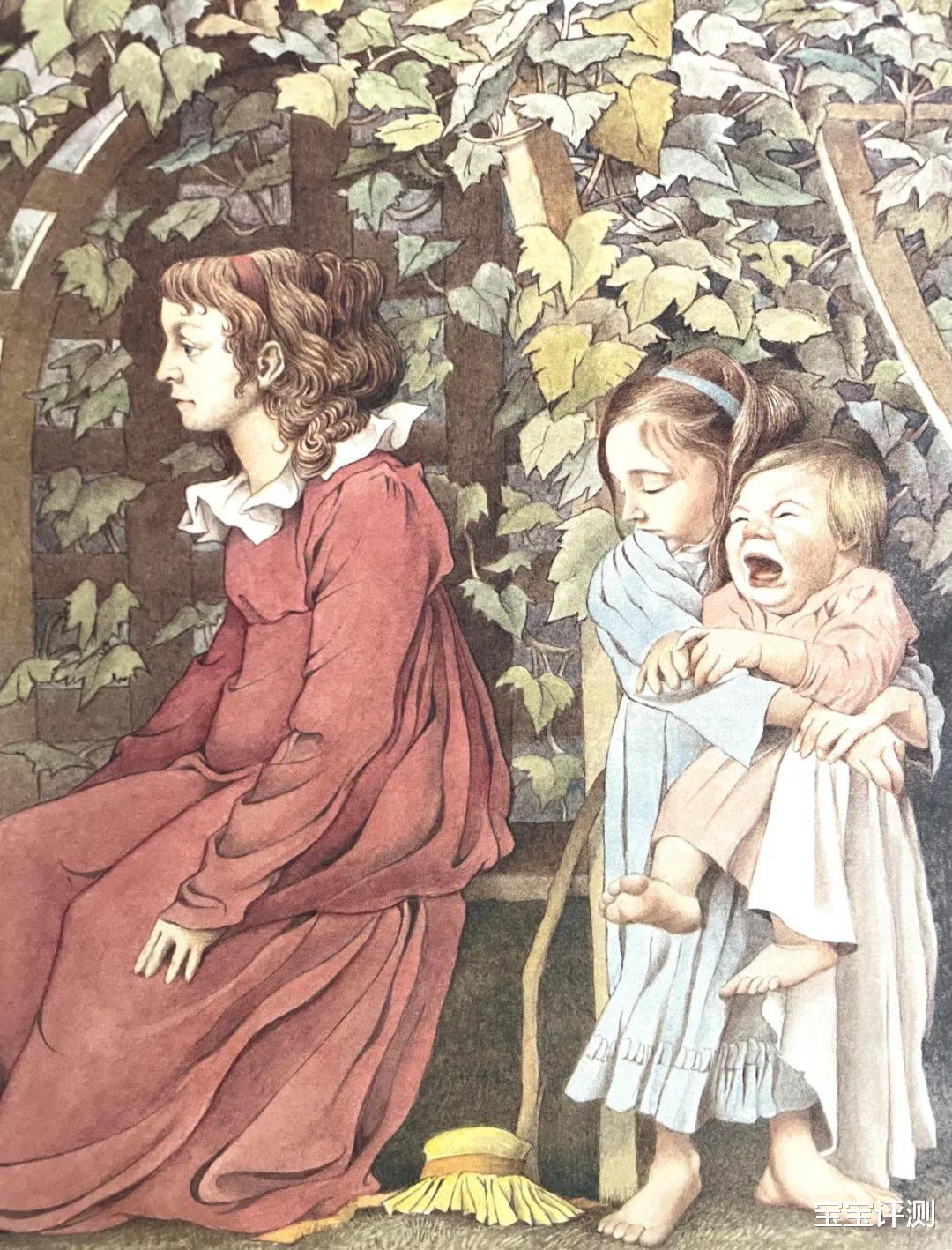 在绘本里,爱达对妹妹的情感并不一味全是爱,她也有讨厌,比如,在花园里带着妹妹玩,在凉亭里抱着哭闹的妹妹时,爱达并不开心。
