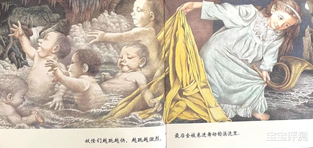 在这本绘本里,桑达克触及了孩童羡慕、嫉妒、恐惧、不安、焦虑、愤怒的情绪,书中的人物看起来也不是很可爱,还有妖怪出现。大画幅的彩色插画,奇幻瑰丽,充满想像,但也有一些诡异的氛围。