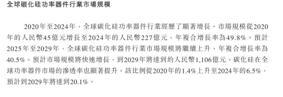 根据弗若斯特沙利文的资料,按2024年收入计,公司在中国大陆碳化硅功率模块市场排名第六,市场份额为2.9%,在中国大陆公司中排名第三;在中国大陆碳化硅分立器件市场及功率半导体栅极驱动市场的排名分别为第九及第九,市场份额分别为2.7%及1.7%。