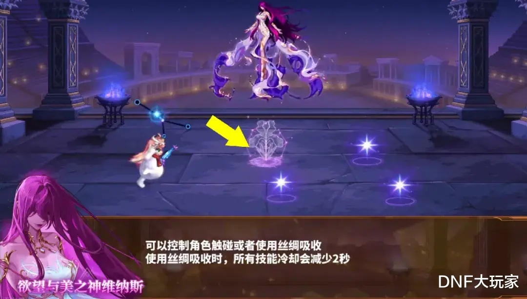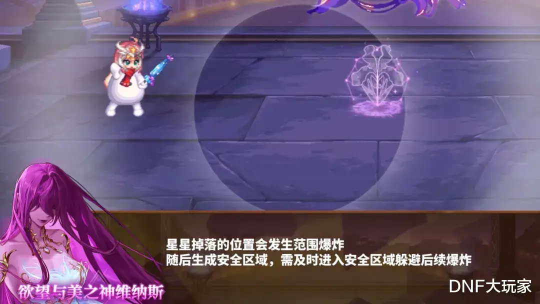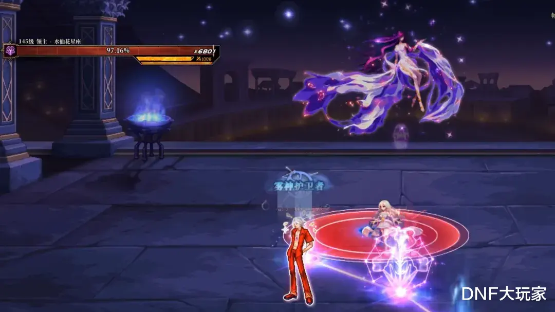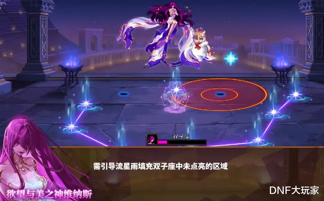 Boss召唤“水仙花星座”,位于场地中间,我们攻击它,造成的伤害,会转移到Boss身上,在攻击时,注意星座旁的流星落攻击,一不小心会被秒。