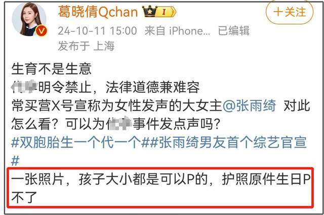 在娱乐圈这个光怪陆离的天地中,明星们的每一个举动都紧紧牵动着无数粉丝的心弦。而当这些举动触及个人隐私、道德底线之际,便会引发一场场舆论的狂风暴雨。近日,葛晓倩的再次发声,将张雨绮推至风口浪尖,代孕这一极为敏感的话题再度成为公众瞩目的焦点。那么,真相究竟如何呢?