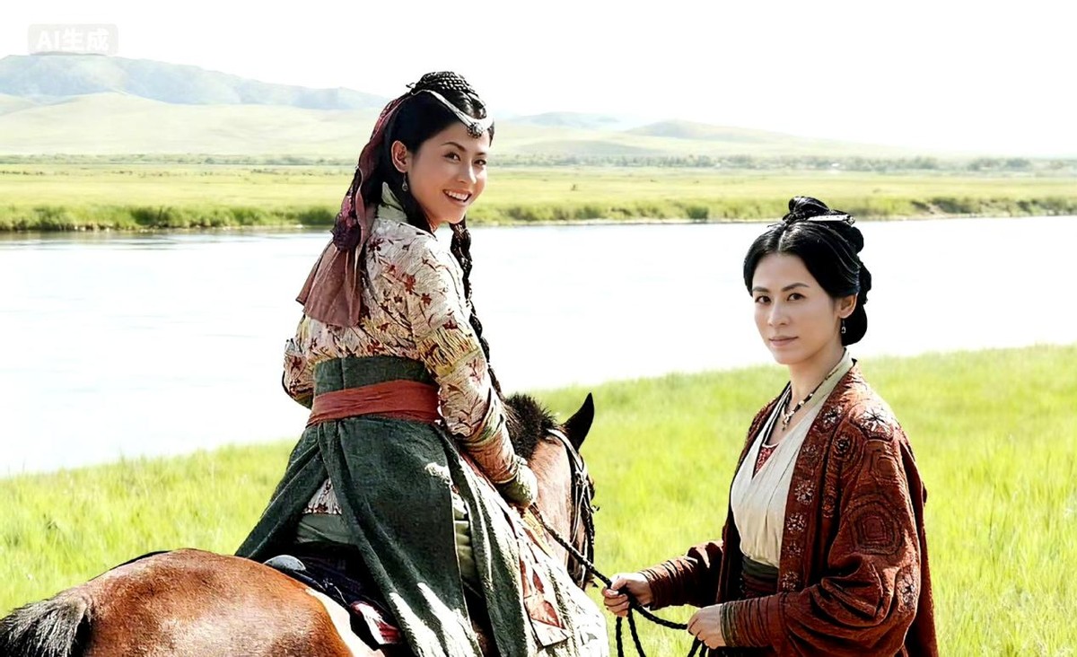 AI合成两人的同框照,少女时期的宣萱骑着马,一脸青春靓丽,而牵着缰绳的中年宣萱,则是看起来更成熟,也更稳了。