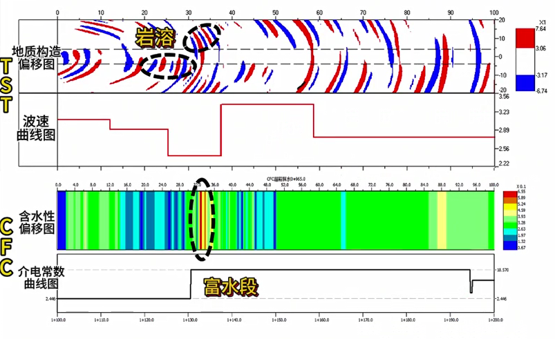 通过实际开挖验证,可以发现二者的结果能够相互呼应,当某段围岩含水时该段必定存在地质构造。同度物探的TST+CFC综合预报解决方案,让隧道施工不再“盲人摸象”,为地下工程安全保驾护航。