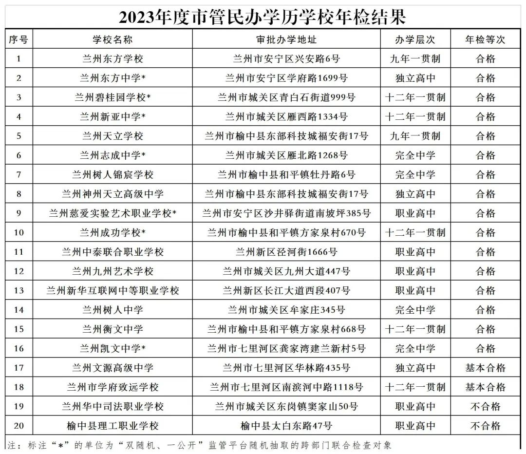 兰州市属10所民办普通高中23年度年检结果:兰州东方中学(合格)、兰州碧桂园学校(合格)、兰州新亚中学(合格)、兰州志成中学(合格)、兰州神州天立高级中学(合格)、兰州成功学校(合格)、兰州衡文中学(合格)、兰州凯文中学(合格)、兰州文源高级中学(基本合格)、兰州市学府致远学校(基本合格)。