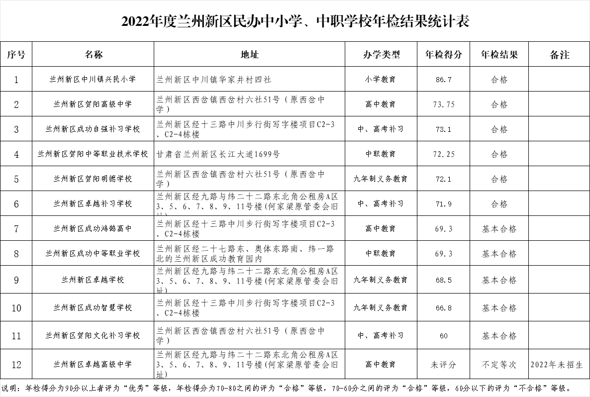 兰州新区管理的3所民办学历学校23年度年检结果未查到,22年度年检结果为:兰州新区贺阳高级中学(合格),兰州新区成功鸿鹄高级中学(基本合格),兰州新区卓越高级中学(未评分,22年未招生)。