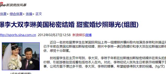 新浪体育2012.2.27——曝李大双李琳美国秘密结婚 甜蜜婚纱照曝光