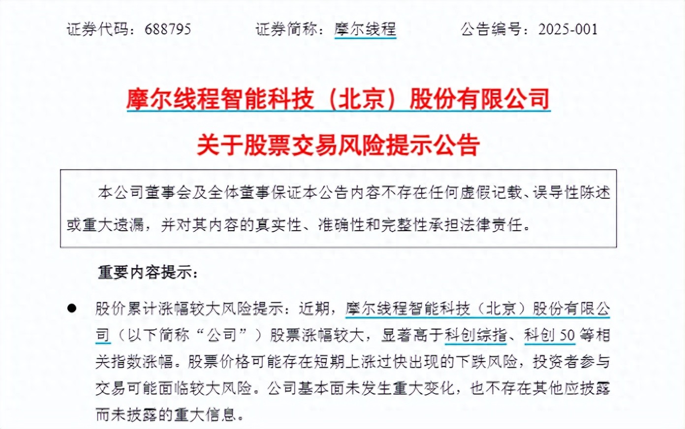 摩尔线程提到,公司最近3个交易日涨幅分别为5.73%、16.98%、28.04%,近日公司股价波动幅度较大,可能存在短期上涨过快出现的下跌风险,可能存在市场情绪过热的情形,可能存在非理性炒作,敬请广大投资者注意二级市场交易风险,审慎决策,理性投资。