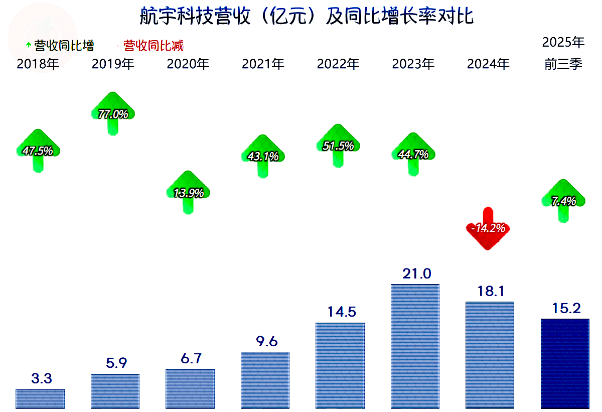 2025年前三季度,航宇科技的营收同比下跌7.4%,虽然还不及2023年同期的水平,但能够扭转2024年下跌的不利形势,还是算表现不错的。
