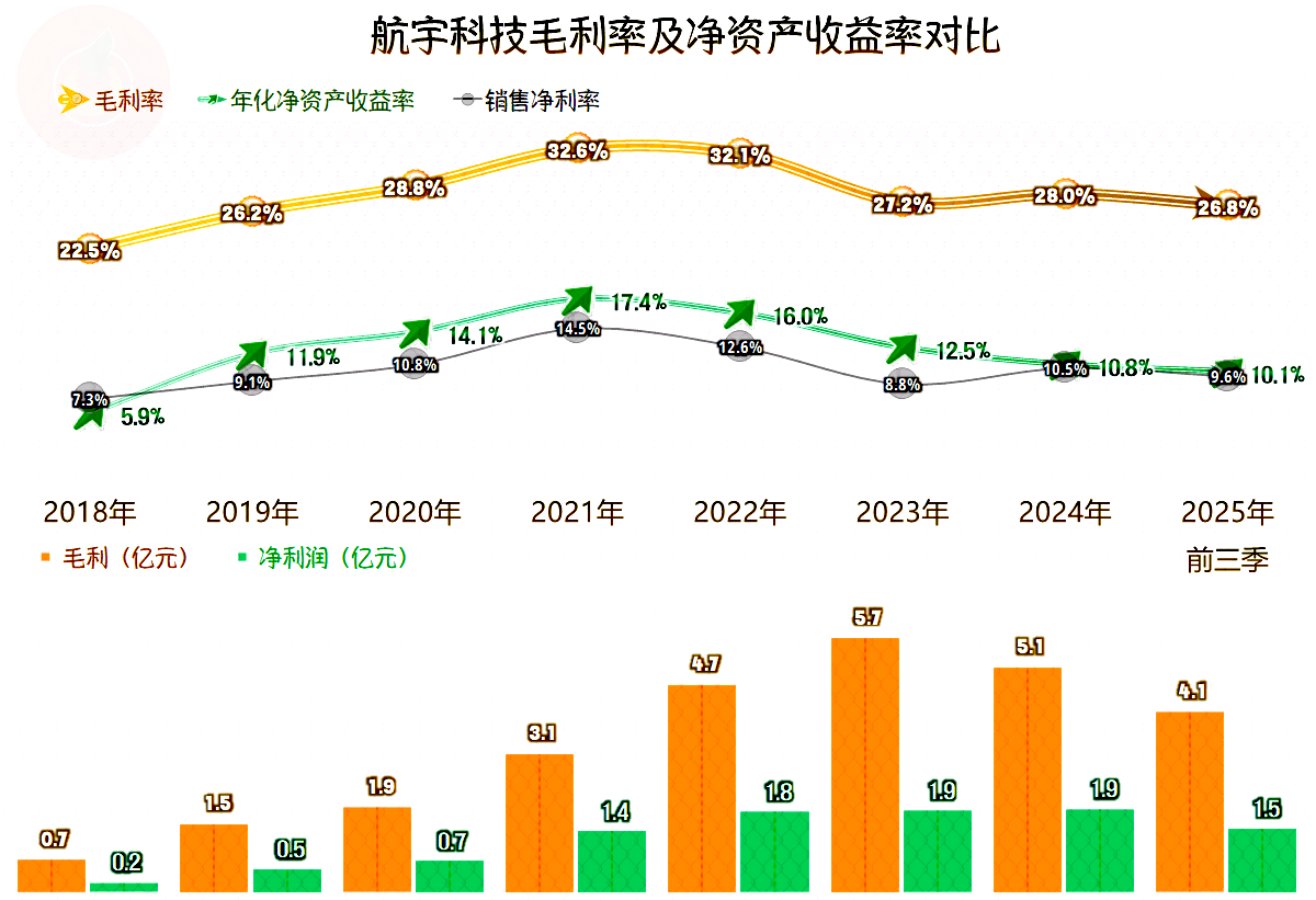 航宇科技的毛利率在2021年和2022年超过了32%,算是达到了其峰值水平,2023年的毛利率大幅下跌至27.2%,之后的2024年和2025年前三季度,都在这一水平附近,暂时是回不到2022年那种水平了。