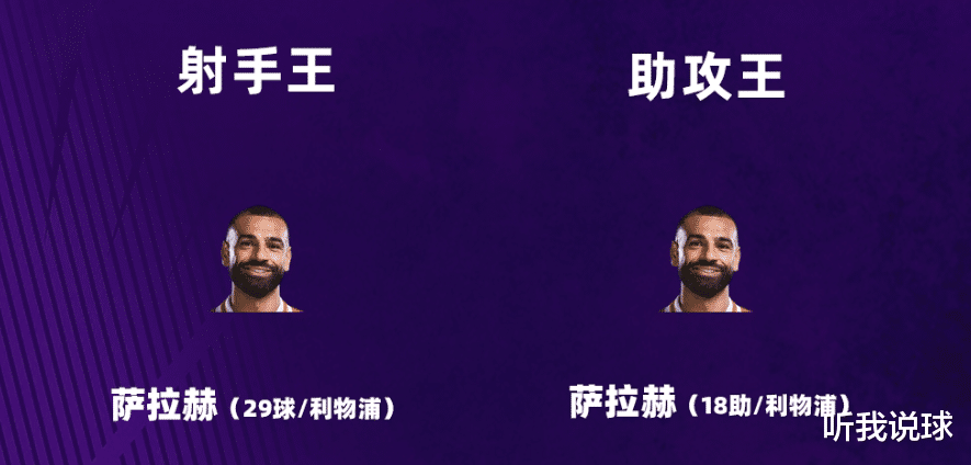 个人荣誉方面,萨拉赫表现堪称惊艳,以29球荣膺金靴,同时还贡献18次助攻,成为助攻王,是利物浦夺冠的最大功臣之一。