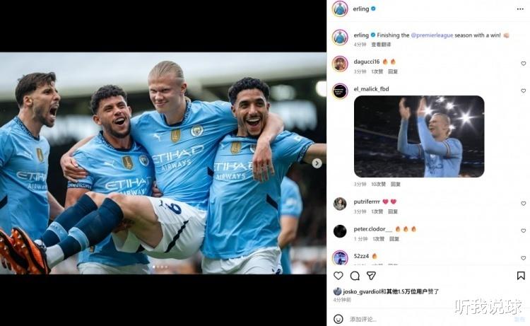 赛后,哈兰德在社媒晒出与队友马尔穆什等人庆祝合影,配文写道:“以一场胜利结束本赛季英超!” 这场胜利不仅为曼城的赛季征程画上圆满句号,也展现出球队强大的实力和斗志。