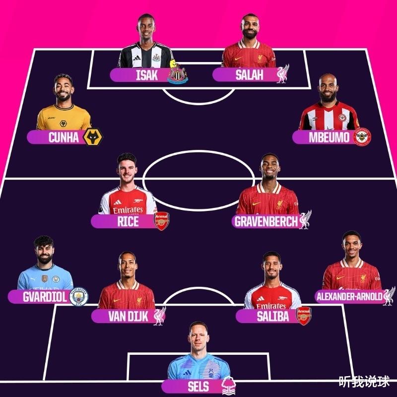 门将:塞尔斯(诺丁汉森林)后卫:格瓦迪奥尔(曼城)、范迪克(利物浦)、萨利巴(阿森纳)、阿诺德(利物浦)中场:库尼亚:(狼队)、赖斯(阿森纳)、赫拉芬贝赫(利物浦)、姆贝莫(布伦特福德)前锋:伊萨克(纽卡斯尔联)、萨拉赫(利物浦)