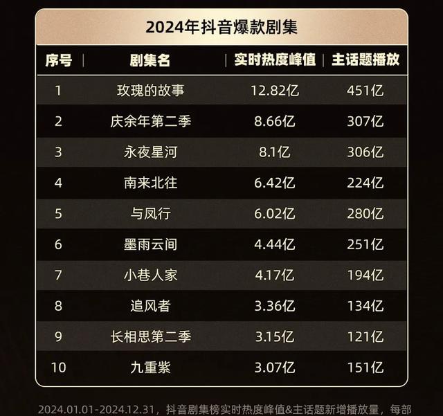 纵观 2024 抖音年度爆款剧集,《玫瑰的故事》《庆余年第二部》《永夜星河》《南来北往》《与凤行》《墨雨云间》《小巷人家》《追风者》《长相思2》《九重紫》成功上榜。其中,既有话题和数据领先的头部大 IP,也有依靠优秀故事默默打动最广谱观众的主旋律内容。《玫瑰的故事》表现尤为亮眼,实时热度峰值高达 12.81 亿,主话题播放量更是飙升至 451 亿,覆盖了不同年龄、性别、地域的人群。