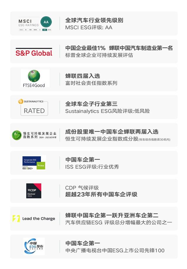 今年已经是吉利汽车连续5年发布ESG报告。凭借ESG管理工作的推进落地、全面详尽的ESG信息和战略披露、和利益相关方的充分交流探讨,吉利汽车2024年ESG相关工作赢得外界的广泛赞誉和权威认可,包括连续三年荣获《财经》双碳领导力“卓越”评级,连续两年位居“中国ESG上市公司先锋100”榜单第八、蝉联中国车企第一名,还获得国际最具权威性的MSCI ESG评级AA级,且连续两年入选恒生可持续发展企业指数,ISS ESG评级行业优秀、中国车企第一等荣誉,充分印证了吉利汽车的中国车企ESG标杆地位。