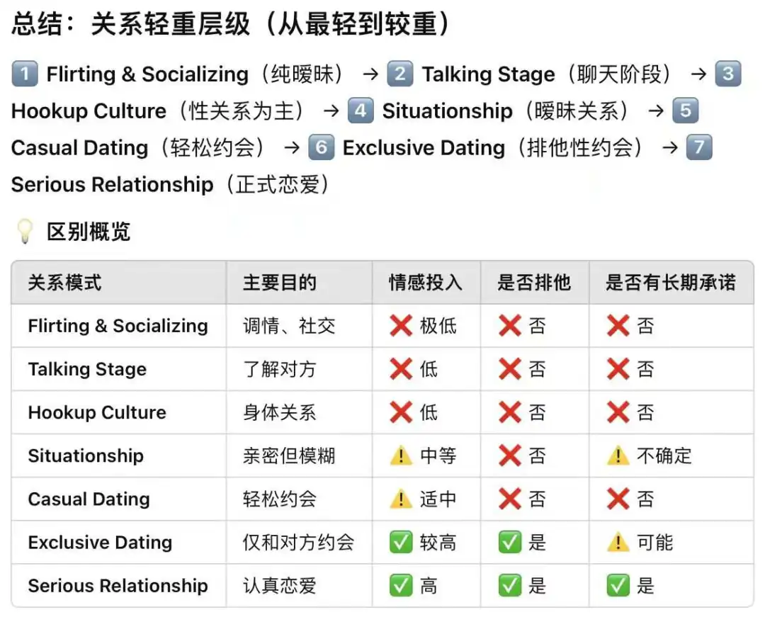 在国外,只奔着认真婚恋对象(serious relationship)去的要提前而且要特别特别说清楚。Dating是主流文化。在国内意识形态是相反的,大部分人都在努力快速确认关系,serious relationship反而是要先说明白的,不能装傻充愣。