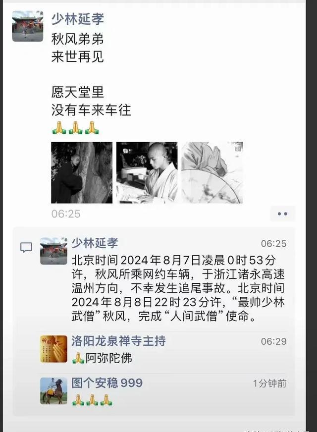 根据知情人士的透露,秋风在8月7日晚上乘坐网约车从浙江诸永高速温州方向行驶时,凌晨零时53分发生了追尾事故。经过紧急救援和医治,秋风最终于8月8日22点确认离世。这一不幸消息让众多粉丝和网友感到心碎,因为秋风在短暂的一生中,不仅仅是少林寺的武僧,更是一个在社交媒体上广受欢迎的明星。