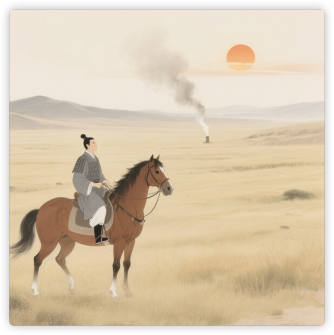 他骑在马上,抬眼望去,那大漠尽头笔直冲天的孤烟,那长河尽头浑圆坠落的落日,在他眼里,不是萧瑟,不是荒芜,那是大唐疆土辽阔无垠的筋骨,是天地间最壮阔的图腾!