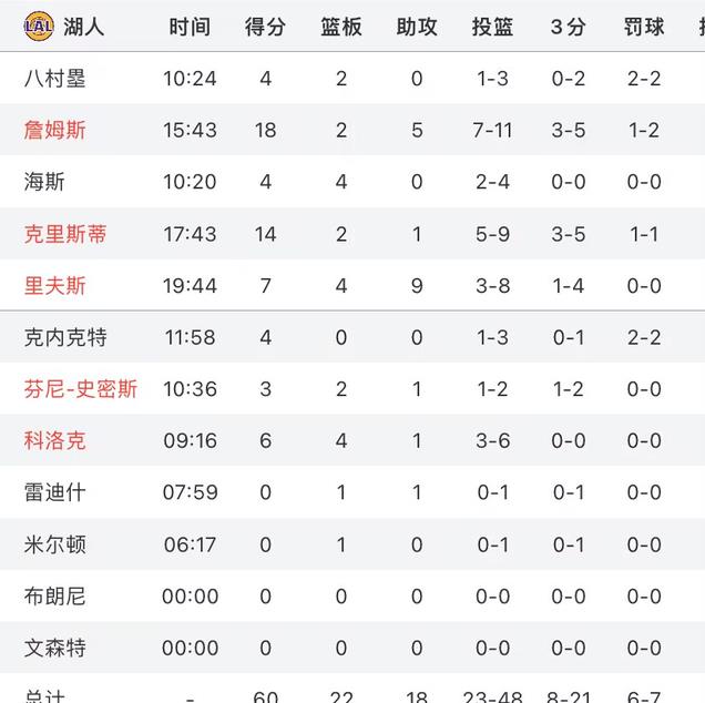 湖人队关键球员评分如下↓