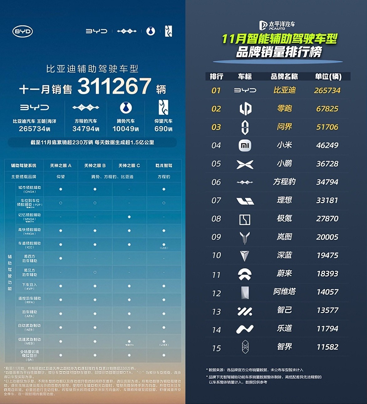近日,比亚迪公布了其搭载天神之眼辅助驾驶系统的车型在11月的销售数据,全月销量达311267辆,继续引领市场。其中,比亚迪王朝与海洋系列贡献265734辆,方程豹、腾势、仰望等高端及个性化品牌亦表现稳健,共同构筑了比亚迪在智能驾驶领域的强大产品矩阵。