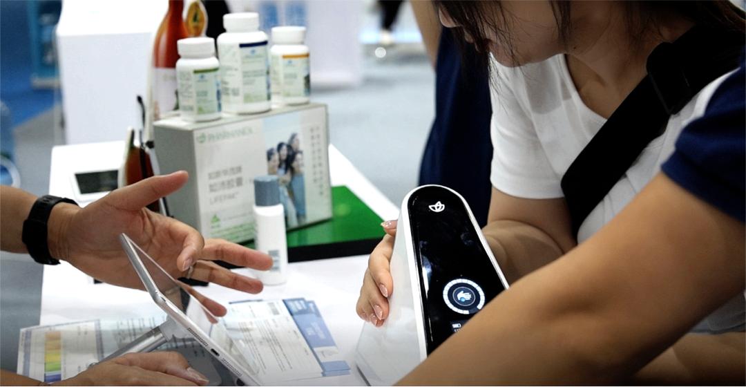 据展位负责人介绍,区别于传统体检的滞后性,这台S3生物光子扫描仪利用诺贝尔物理学奖的生物光学技术——拉曼共振光谱法,手掌触摸仪器时会发出特定波长的蓝光,蓝光会与皮肤表层的类胡萝卜素产生反应,仪器通过检测扫描结果判断类胡萝卜素浓度,让每个人都能轻松、快速且精准地了解身体的抗氧化状况,从而评估出日常摄入的营养素是否提供了必需和足够的抗氧化保护和最佳营养支持,让健康成果真正可量化。