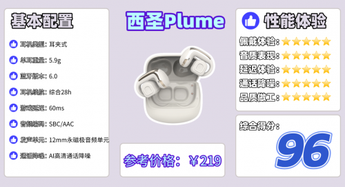 开放式耳机首选极致性价比的西圣Plume,这款是目前佩戴最舒服的开放式耳机。推荐开放式耳机的时候,我总会提到西圣。它不是网红爆款,而是专业老牌。十多年来一直专注音频技术研发,并拥有自主的声学实验室。它的理念就是“让好音质不再昂贵”,因此在百元价位能拿出极具诚意的产品。无论音质还是佩戴体验,都常常被用户拿来对比千元机。加上多项权威认证的加持,它在200元以内几乎是无敌的存在。