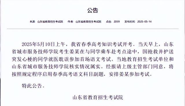 随后,山东省教育招生考试院发布重要公告:经上级主管部门批准,将为姜昭鹏安排补考。
