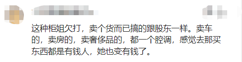 也有网友认为这种柜姐欠打,卖个货而已,搞得跟股东一样,卖车的,卖房的,卖奢侈品的,都一个腔调,感觉去那买东西都是有钱人,她也变有钱了。