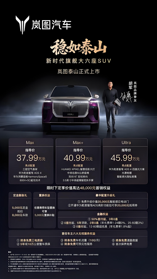 岚图泰山的杭州区域上市,不仅标志着岚图完成了SUV、MPV、轿车的全品类旗舰布局,更以“满配旗舰”的产品实力,重新定义了40万级大六座豪华SUV的价值标准。未来,这款兼具东方气韵与硬核科技的旗舰车型,将持续为杭州及周边地区用户带来更高品质的出行体验,推动华系豪华新能源车型在高端市场的“争峰”进程。
