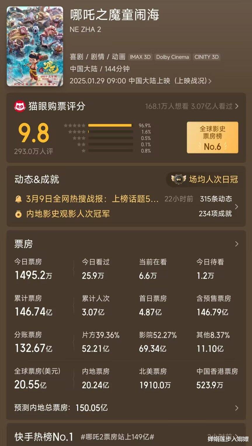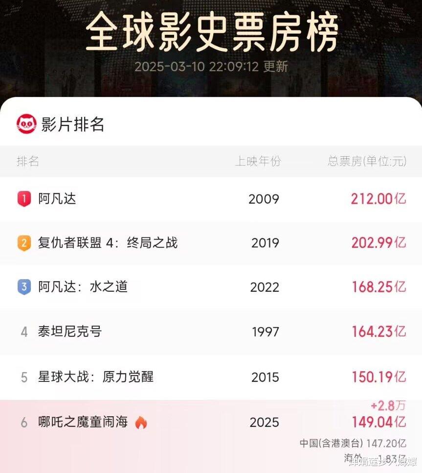 截至3月10日,《哪吒2》这部现象级动画的全球票房已突破149.03亿元,直逼影史第五名《星球大战:原力觉醒》(150.19亿),最快本周末即可完成超越。然而,对于无数期待它登顶全球票房冠军的观众而言,前方仍有《泰坦尼克号》(164.23亿),第三名的《阿凡达:水之道》(168.25亿);第二名的《复仇者联盟4:终局之战》(202.99亿)和影史冠军《阿凡达》(212亿)这样高不可攀的四座大山。