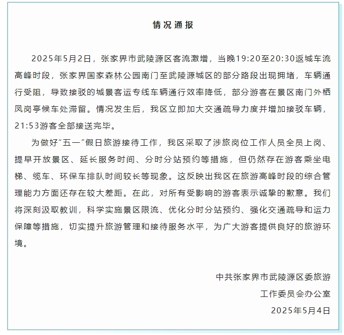 5 月 2 日 19 时许,张家界国家森林公园南门至武陵源城区路段因返城车流高峰陷入拥堵,导致接驳的城景客运专线车辆通行效率骤降。上千名游客在栖凤岗亭候车处滞留近两小时,部分游客因体力不支瘫坐地上,现场秩序一度混乱。直至 21 时 53 分,景区通过增派车辆、疏导交通才完成全部游客转运。