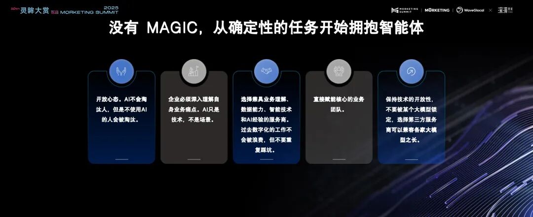 最后给大家一个务实建议:不必神话智能体。确定性的结果,必然源于确定性的业务起点。选择一个具体的业务场景切入,因为智能体的核心是直接交付营销任务结果,且可被实时验证。从单一场景感受其价值,是品牌落地智能营销最简单、最可靠的路径。