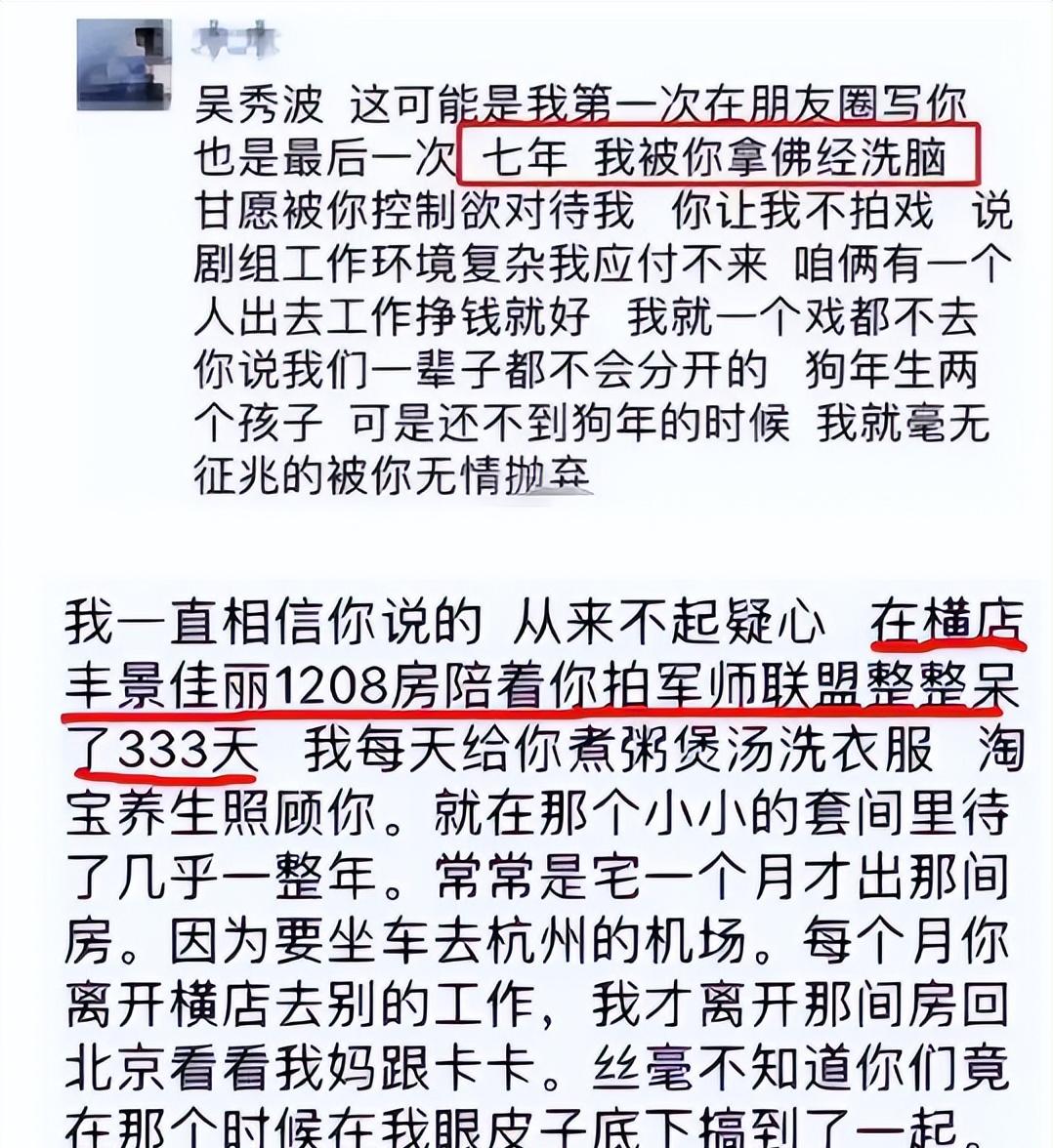 她曾在剧组照顾吴秀波的饮食起居长达一年,甚至为了避人耳目,一个月不出门。