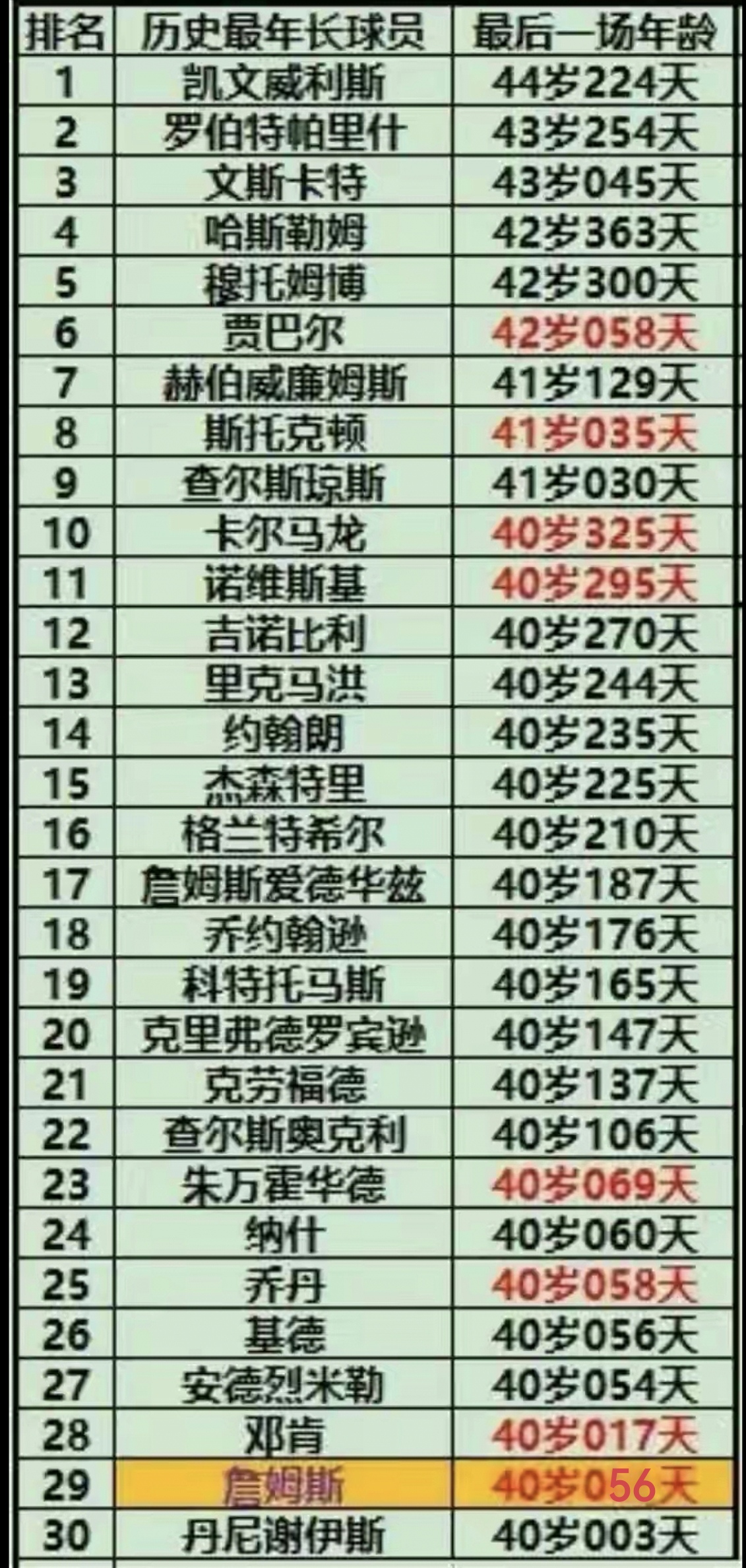 乔丹打到40岁58天,吉诺比利打到40岁270天,贾巴尔打到42岁58天,排名第一的竟然打了44岁224天。