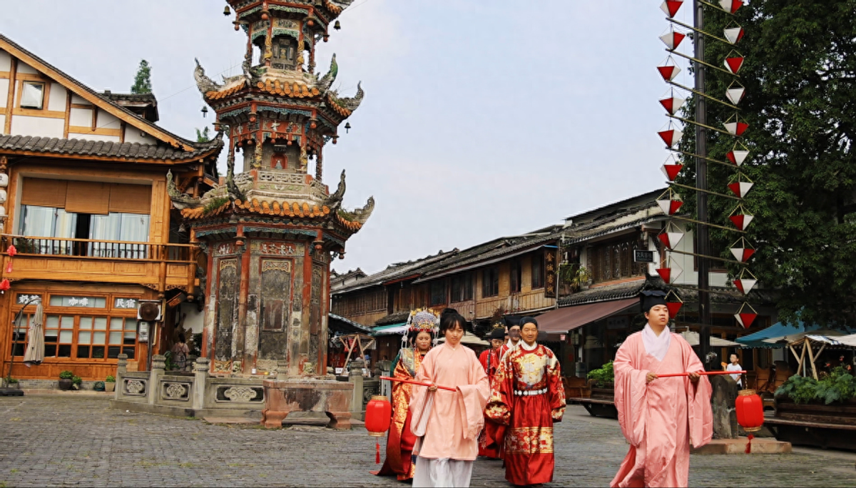 据介绍,西来古镇“夫妻树下集体汉服婚礼”旨在鼓励年轻人回归传统习俗的婚宴方式,减少大操大办,以实际行动践行婚俗新风,活动共吸引了超过30多对新人报名。婚礼仪程结束后,由新人和汉服同袍组成的巡游队伍穿越古镇,汇成了一道浪漫唯美的风景线。