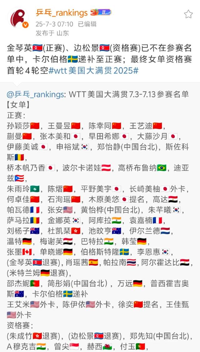 WTT世界乒联|#WTT美国大满贯2025# 参赛名单更新.2025