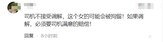 也有网友讲明,司机不接受调解,这个女的可能会被拘留!如果调解,必须要司机满意的赔偿!