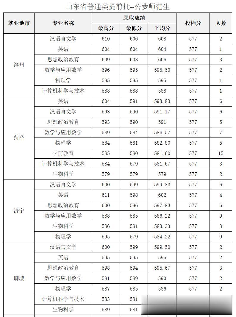 录取最低分为573分,物理学专业(省属公费师范生,面向济宁市就业),物理学专业(省属公费师范生,面向枣庄市就业) ,物理学专业(省属公费师范生,面向菏泽市就业),化学专业(省属公费师范生,面向济宁市就业) 。