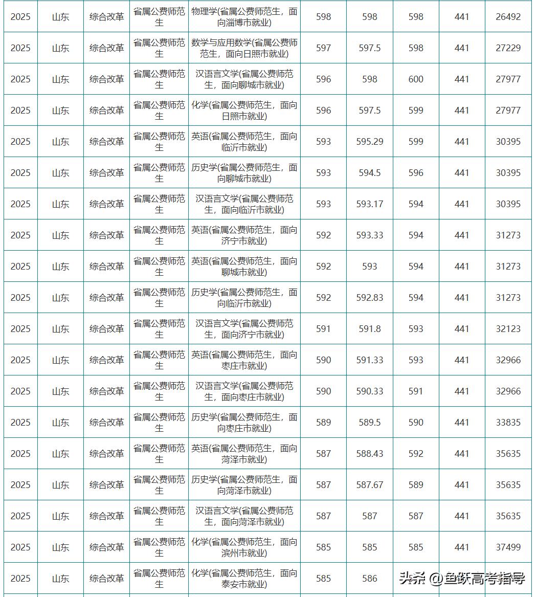 录取最低分为587分,小学教育专业(省属公费师范生面向菏泽市就业)。