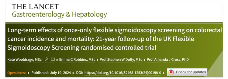 [1]Atkin W, Wooldrage K, Parkin DM, et al. Long term effects of once-only flexible sigmoidoscopy screening after 17 years of follow-up: the UK Flexible Sigmoidoscopy Screening randomised controlled trial. Lancet. 2017;389(10076):1299-1311. doi:10.1016/S0140-6736(17)30396-3